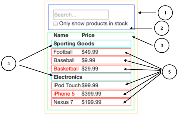FilterableProductTable(オレンジ色): このサンプル全体を含むSearchBar(青色): すべてのユーザ入力を受け付けるProductTable(緑色): ユーザ入力に基づくデータの集合を表示・フィルタするProductCategoryRow(水色): カテゴリを見出しとして表示するProductRow(赤色): 各商品を 1 行で表示する